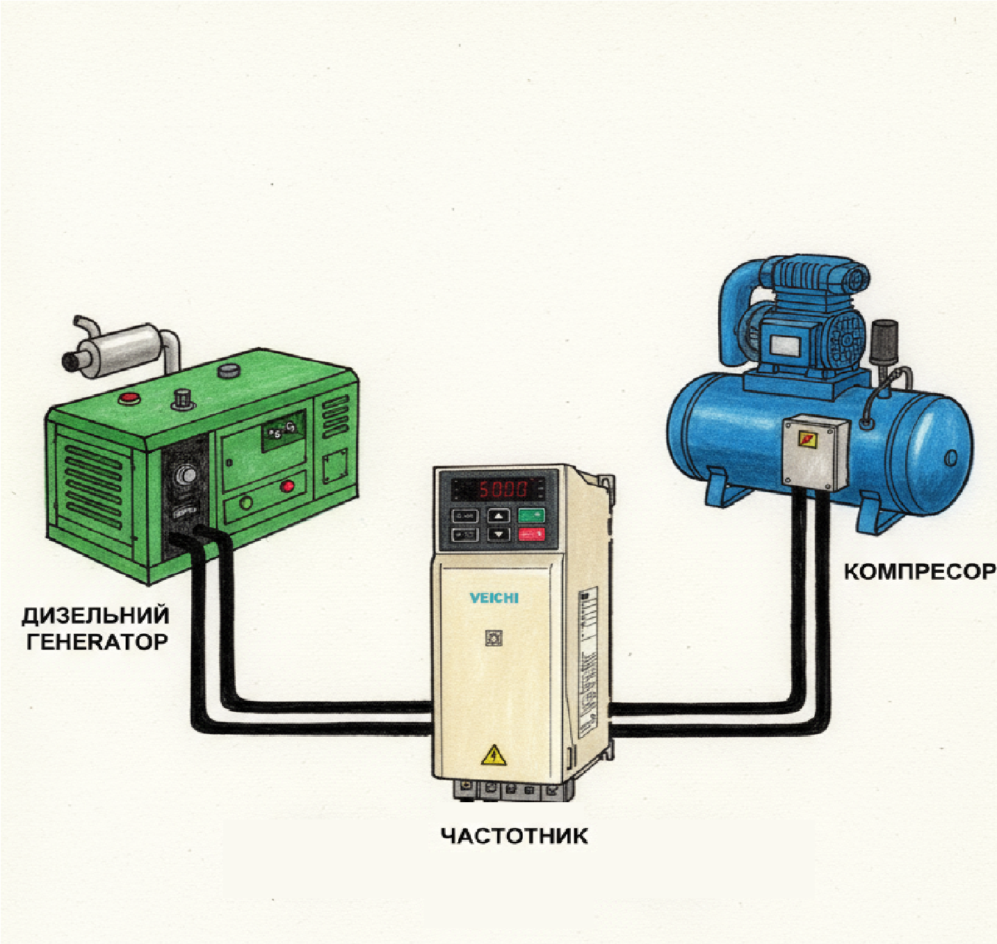 Генератор має дуже низьку перевантажувальну здатність – тобто він не може дуже короткочасно – на протязі декількох секунд видати на 10-30% більше своєї номінальної потужності. Але як правило цього мало для запуску двигуна. Класична ситуація у клієнта є наприклад компресор із номінальним споживаним струмом 15 Ампер (7,5 кВт). Для його запуску потрібен компресор який може видавати як мінімум ампер 75-90 (десь 45-50 кВт). Купляти такий компресор заради пуску є дуже не доцільним. Але є варіант купити генератор з вихідним струмом 23-28А (порядку 11 кВт) і запустити компресор. Це рішення – перетворювач частоти. Чудово з цією задачею справляються перетворювачі частоти Veichi серії AC310 або AC10. Частотний перетворювач при правильних налаштуваннях суттєво знижує значення коефіцієнта k до 1,1-1,5. Таким чином суттєво знижується необхідна потужність генератора, що дуже-дуже суттєво економить інвестиції.