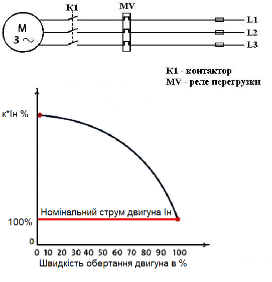 Спрощено залежність струму від швидкості розгону двигуна можна представити таким графіком. Це відповідає коли двигун запускається напряму від мережі за допомогою пускача. Проаналізуємо цей графік. Коли пускач не замкнений двигун не обертається. В момент замикання пускача ротор двигуна ще не обертається а напруга уже поступає. Виникає момент якби «короткого замикання» і як результат струм росте до величини k*Ін.