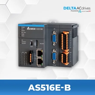 AS516E-B Delta AS500 CPU module, 16DI/8DO (transistor), EtherNet/IP, 24VDC power, up to 32 expansion modules.