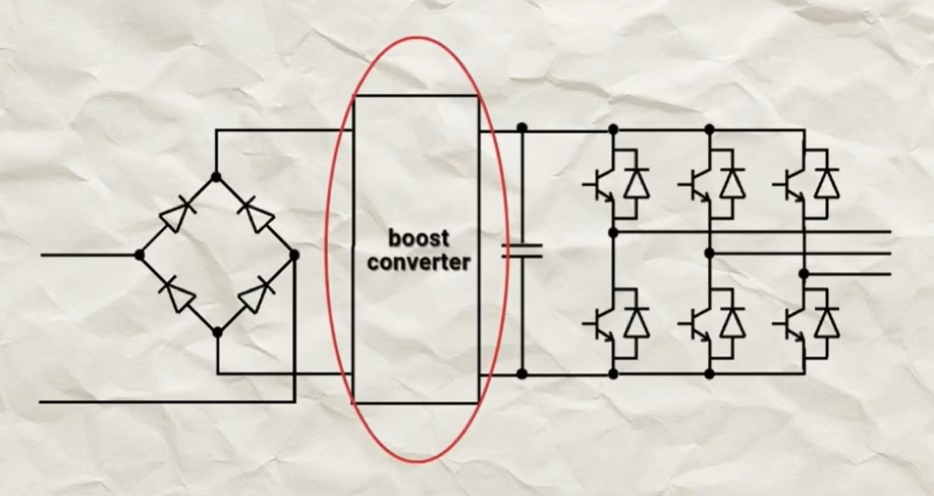 Напряжение с переменного 220В выпрямляется в постоянное примерно 310В. Логично было бы туда поставить узел повышения напряжения (boost converter) – повысить до 540В постоянного и из него сделать 3ф напряжение 380В переменного. Но boost converter, как правило, используют для повышения на небольшой вольтаж – блоки питания, которые из 12 В делают 24 или 30В, да и на небольшие мощности, как правило, до 500Вт. Основной элемент такого boost converter – это дроссель, в котором запасается энергия. Но если рассматривать такой повышающий преобразователь для частотника 2,2 кВт, то его габариты и вес были бы раза в три больше, чем частотника на 2,2 кВт с 3-фазным входом, да и цена была бы раз в 5 выше. Поэтому если продавец утверждает, что в частотнике есть встроенный boost converter, и он по размерам как обычный частотник, и цена не сильно отличается, прерывайте разговор – продавец либо не владеет информацией о товаре, либо просто обманывает. Со встроенным boost converter частотник будет очень габаритным, тяжелым и дорогим, но правильным с точки зрения схемотехники и выходных характеристик.