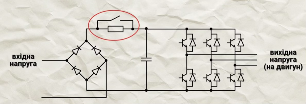 В классическом исполнении частотника конденсатор должен заряжаться медленно через зарядный резистор, который шунтируется в конце заряда с помощью реле.