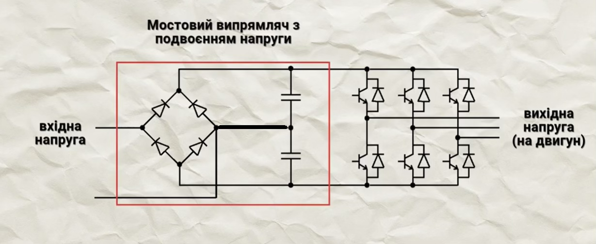 Таким образом, мы получим двойное напряжение звена постоянного тока, а именно не 310, а 620 Вольт. Имея такое напряжение, инвертор может «нарезать» необходимое напряжение 380, 400 или 440 Вольт.